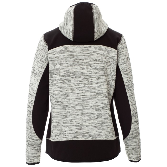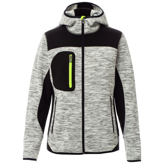 Sweter z dzianiny technicznej z czarnymi wstawkami Soft-shell, dwukolorowy, długi zamek błyskawiczny SBS wykończony taśmą, kaptur z podwójnymi szwami, wąskie wykończenie mankietów i dołu, dwie kieszenie boczne z zamkiem błyskawicznym, jedna kieszeń na klatce piersiowej.