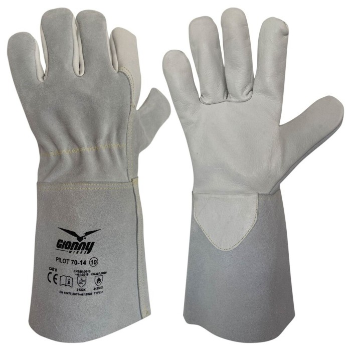Rękawica spawalnicza ze stroną wewnętrzną i palcem wskazującym z licowej skóry bydlęcej, stroną grzbietową z dwoiny skórzanej bydlęcej i mankietem 14 cm z dwoiny skórzanej bawolej.
