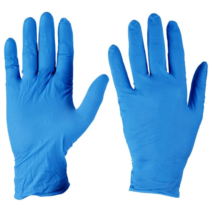 Rękawice nitrylowe jednorazowego użytku, oburęczne, niepudrowane, gramatura pojedynczej sztuki 5 g (rozmiar M), średnia grubość 0,09 mm (mierzona na wewnętrznej stronie dłoni).