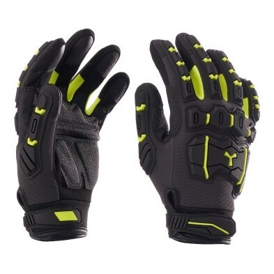 Poliestrowa rękawica odporna na uderzenia, wzmocnienie z gumy SBR-poliestru na wewnętrznej stronie dłoni, między kciukiem, palcem wskazującym i opuszkami palców, aby zwiększyć przyczepność, odporność na ścieranie i pochłanianie lekkich wibracji.