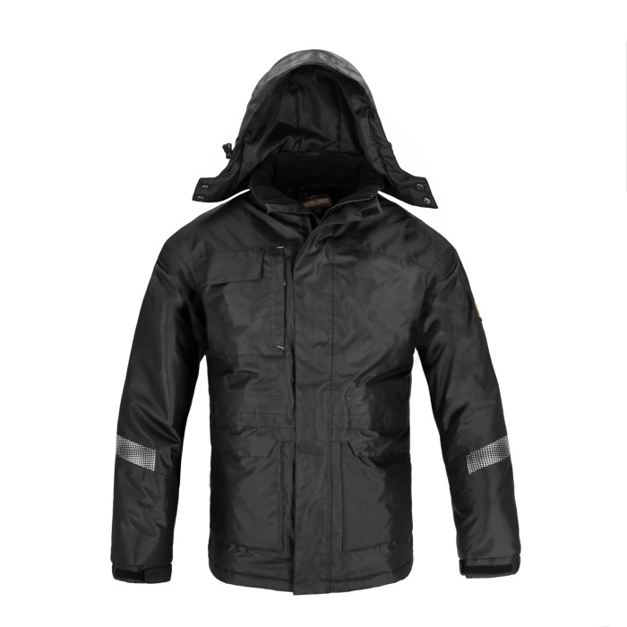 Kurtka ocieplana z poliestrową podszewką oraz warstwą zewnętrzną wykonaną w 100% z impregnowanego poliestru. Zasuwana na zamek błyskawiczny osłonięty listwą na rzepy. Posiada kieszeń górną zapinaną na rzep, dwie kieszenie dolne osłonięte klapami na rzep, a także małą zapinaną kieszeń od strony wewnętrznej. Podklejane szwy zwiększają odporność na warunki atmosferyczne. Wysoka stójka kołnierza chroniąca przed wiatrem obszyta całkowicie od wewnątrz miękkim polarem. Rękawy ze ściągaczami z dodatkowym zapięciem zwiększają komfort jednocześnie poprawiając izolację termiczną. Kurtka posiada odpinany kaptur ściągany za pomocą troczków. Dół kurtki z regulacją obwodu. Rozmiary: S-XXL. Pakowanie: 1/10 karton.