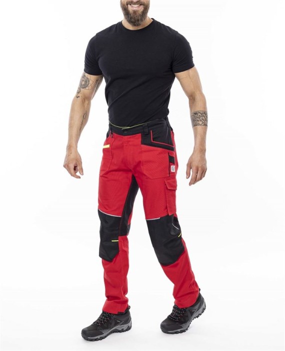 spodnie wyposażone w uchwyt d-ring na karabińczyk, 2 głębokie kieszenie otwarte wzmocnione materiałem Oxford, 1 przednią kieszeń na zamek, 1 przednią kieszeń narzędziową z szeroką pętlą, na prawej nogawce umieszczona wielofunkcyjna kieszeń na składaną miarkę, śrubokręt i nóż, na lewej nogawce duża podwójna kieszeń kryta patką na zatrzask
