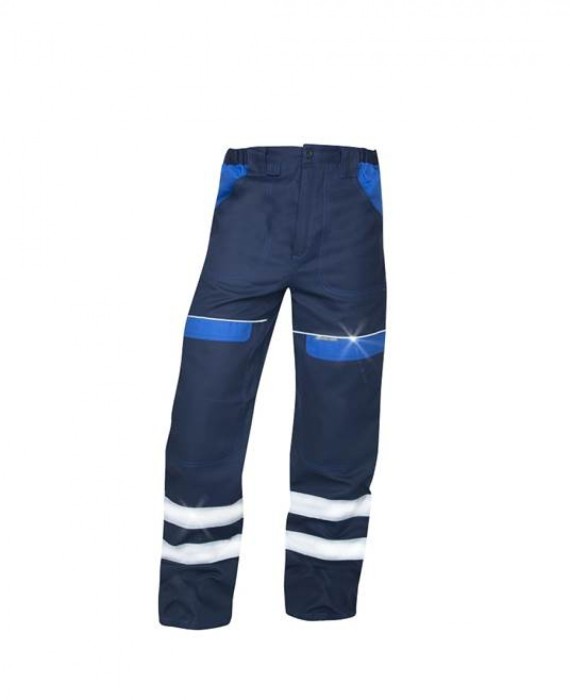 Spodnie do pasa odblaskowe COOL TREND/ ARDON spełniają normy EN 13688 (odzież ochronna, wymagania ogólne). Bardzo komfortowe w noszeniu spodnie robocze w wariantach kolorystycznych: zielono-czarnym, niebiesko-czarnym, czarno-szarym, rozmiary: 46-66. Wykonane ze 100% bawełny o splocie diagonalnym/ 260g/m2. Tkanina jest wytrzymała mechanicznie a jednocześnie miękka i wygodna w użyciu. Fason REGULAR FIT pozwala na pełną swobodę ruchów. Idealne dopasowanie zapewnia elastyczny pas, szlufki do paska, główne zapięcie na zamek i guzik. Spodnie posiadają wielofunkcyjne kieszenie: dwie tylne kieszenie kryte patką, dwie pojemne kieszenie przelotowe i boczne kieszenie na narzędzia. Spodnie wyposażono w dwa pasy odblaskowe i wypustki odblaskowe, które zwiększają bezpieczeństwo po zmroku i w zacienionych miejscach. Wzmocnione kolana są odporne na przetarcia i uszkodzenia mechaniczne. Bardzo wygodne i jednocześnie wytrzymałe spodnie robocze sprawdzą się przy każdej pracy. Dedykowane dla branży budowlanej, montażowo-instalacyjnej, do prac magazynowych, porządkowych, warsztatowych.