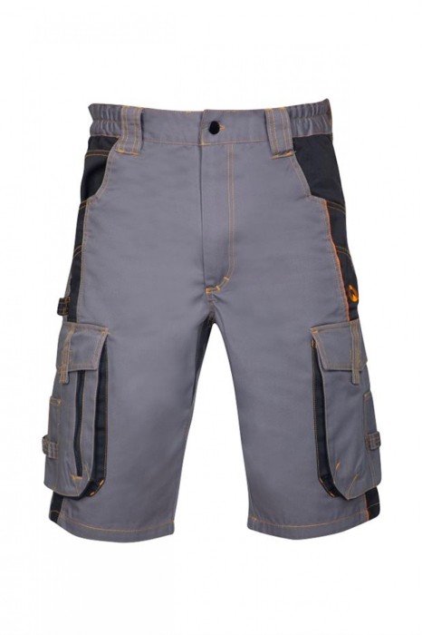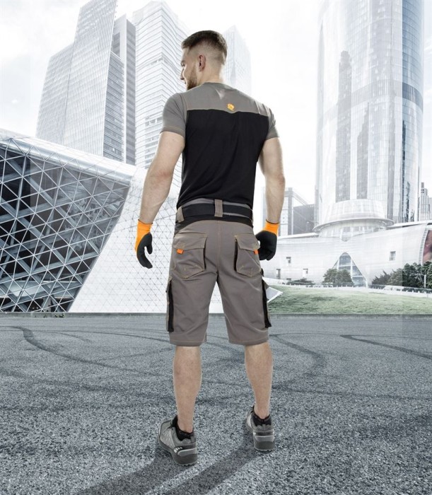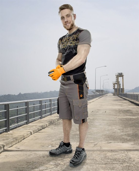 Spodenki robocze w oryginalnym stylu. Interesujące elementy wizualne takie jak kontrastowe pikowanie nicią dżinsową i designerskie wzmocnienie plis. Znaczące podwyższenie tylnej części zapewnia osłonę pleców również w ruchu, elastyczny kołnierz w pasie ze zintegrowaną gumą zwiększa komfort noszenia, 2 przednie kieszenie przelotowe, 2 tylne kieszenie kryte plisą, 2 przestrzenne kieszenie miechowe na lewej i prawej nogawce kryte plisą, 1 kieszeń z suwakiem na komórkę do wielkości 5,6“, kieszenie na śrubokręt, uchwyty na ołówki, 2 kieszenie na miarkę składaną zintegrowane z lampasem po lewej i prawej stronie, dodatki odblaskowe w przedniej i tylnej części zwiększające widoczność.