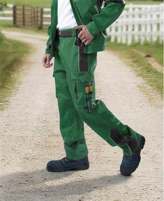 Spodnie robocze do pasa z kieszenią na nakolanniki, 2 przednie kieszenie przelotowe, 2 tylne kieszenie kryte plisą, 2 przestrzenne kieszenie miechowe na lewej i prawej nogawce kryte plisą, 1 kieszeń z suwakiem na komórkę, kieszenie na śrubokręt, uchwyty n...