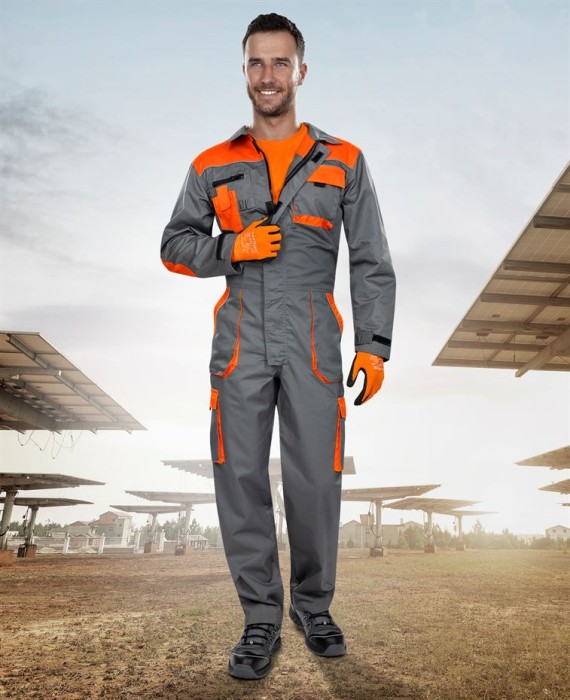 Kombinezon 2STRONG/ ARDON spełnia normy EN 13688 (odzież ochronna, wymagania ogólne). Bardzo komfortowy w noszeniu kombinezon roboczy zapewnia ochronę całego ciała. Występuje w kolorze szaro-pomarańczowym, rozmiary od 46 do 66. Wykonane z wysokiej jakości mieszanki materiału 20% bawełna, 80% poliester, ok. 235 g/m2.Tkanina jest wytrzymała mechanicznie a jednocześnie miękka i wygodna w użyciu. Fason REGULAR FIT z klasycznym kołnierzem pozwala na pełną swobodę nie krępuje ruchów podczas pracy. Idealne dopasowanie zapewnia elastyczny pas w części tylnej, komfort noszenia zwiększa regulacja szerokości rękawów i nogawek za pomocą paska z rzepem. Zapięcie główne na suwak kryty plisą z rzepami. Kombinezon posiada wielofunkcyjne nakładane kieszenie: w części piersiowej - jedna kieszeń kryta plisą z rzepem, jedna na zamek, jedna na telefon i szlufki na ołówki, w części dolnej - dwie kieszenie w części tylnej kryte plisą z rzepem, kieszenie przelotowe z przodu, kieszenie boczne na nogawkach kryte plisą z rzepem. Wzmocnione barki i łokcie, odporne na przetarcia i uszkodzenia mechaniczne. Kombinezon wyposażono w elementy odblaskowe, które zwiększają bezpieczeństwo po zmroku i w zacienionych miejscach. Bardzo wygodny i jednocześnie wytrzymały kombinezon roboczy sprawdzi się przy każdej pracy. Dedykowany dla brukarzy, budowlańców, branży montażowo-instalacyjnej, do prac magazynowych, porządkowych, warsztatowych.