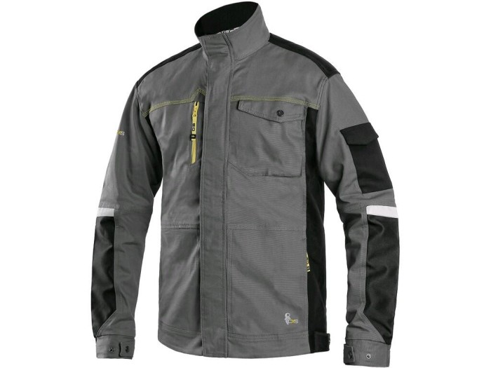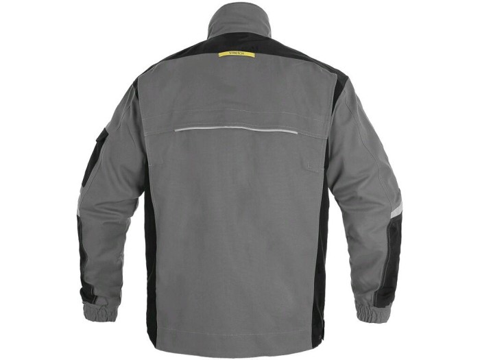 Męska bluza robocza - skrócona wersja dla wysokości 170-176 cm. Tkanina stretch zapewniająca swobodny ruch, ramiona wzmocnione poliesterem 600D, rękawy z regulowanym mankietem, kieszeń z klapką na lewym rękawie, przykryte zapinanie na zamek i zatrzaski, kieszenie na piersiach zapinane na zatrzask i zamek, boczne kieszenie na zamek, regulowany pas, wentylacja z tyłu, elementy odblaskowe. Zalecane zastosowanie: inżynieria, budownictwo, przemysł lekki, motoryzacja, logistyka, magazyn, spedycja, garaż, konserwacja, montaż, rolnictwo, ogród, hobby.