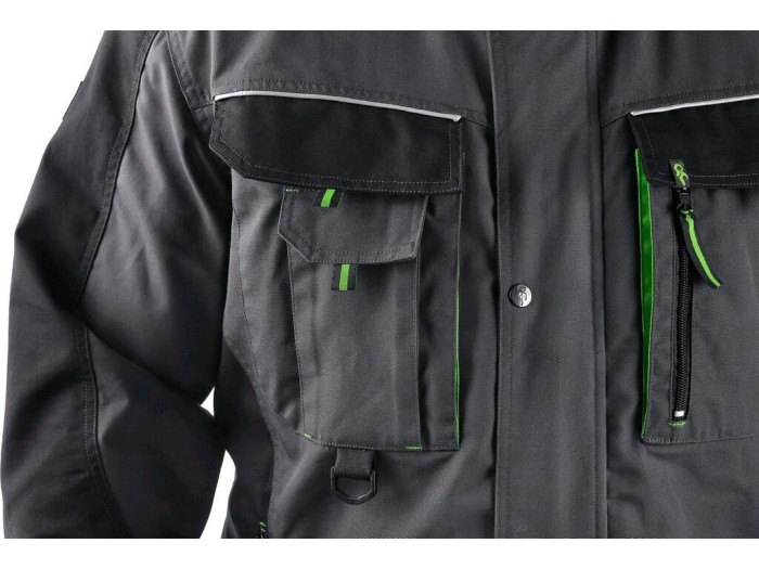 Męska bluza robocza - skrócona wersja dla wysokości 170-176 cm. Ramiona wzmocnione poliestrem 600D, rękawy z regulowanym mankietem, przykryte zapinanie na zamek i zatrzaski, wielofunkcyjne kieszenie na piersiach, boczne kieszenie na zamek, regulowany pas, elementy odblaskowe. Zalecane zastosowanie: budownictwo, inżynieria, przemysł lekki, przemysł samochodowy, logistyka, magazyn, spedycja, autoserwisy, utrzymanie, montaż, rolnictwo, ogród, hobby.