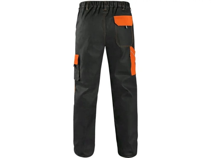 Spodnie robocze męskie, pas ze szlufkami na pasek, z tyłu wszyta guma, przednie kieszenie, kieszeń boczna na zwijany / składany metr, kieszeń boczna na telefon komórkowy / portfel, podwójne kolana, kieszeń tylna z patką.