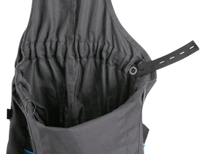 Dziecięce ogrodniczki z lekkiego materiału, kieszeń na piersi zapinana na zamek, zapięcie boczne na guziki, z tyłu guma z guzikiem do dostosowania rozmiaru, kieszenie klinowe z przodu, zwykła kieszeń z tyłu, wzmocnione kolana, szelki z tyłu na gumę, elementy odblaskowe.