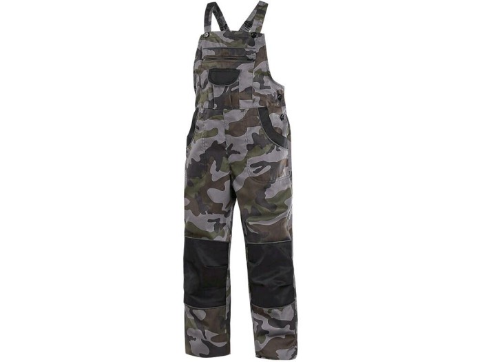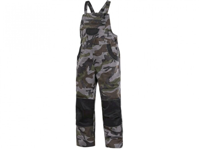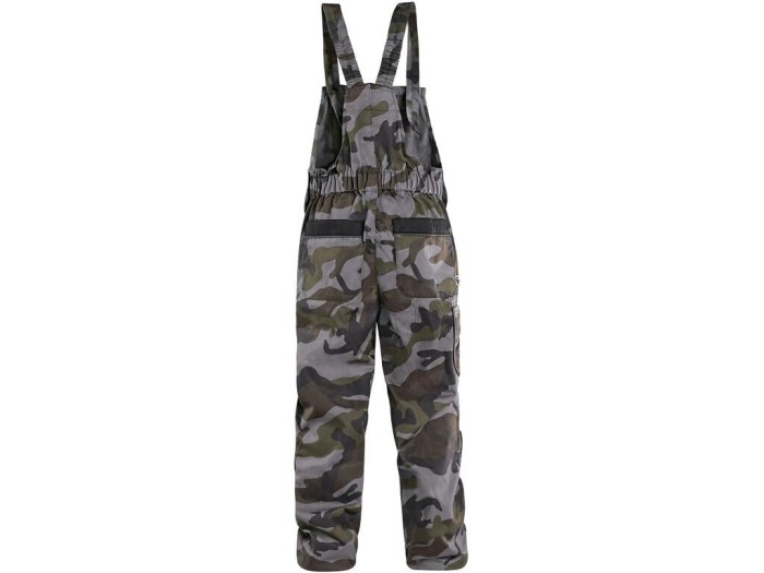 Dziecięce ogrodniczki moro, wzmocnione kolana i krocze. Pas na guziki z wszytą gumą z tyłu, szelki z gumą z tyłu kieszeń na piersi z mniejszą kieszonką, przednie i tylne kieszenie, boczna kieszeń, elementy odblaskowe.