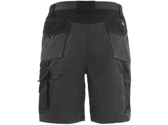 Szorty robocze męskie, pas ze szlufkami na pasek i gumą na bokach, kieszenie klinowe z przodu, kieszenie wielofunkcyjne z obu stron, dwie kieszenie z patkami.
