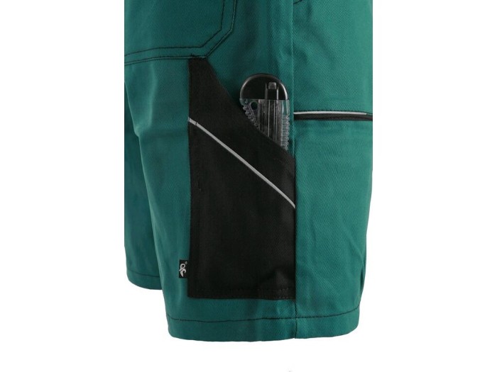 Męskie szorty robocze, pas ze szlufkami na pasek, z tyłu wszyta guma, przednie kieszenie, kieszeń boczna na zwijany / składany metr, kieszeń boczna na telefon komórkowy / portfel, kieszeń tylna z patką, elementy odblaskowe.
