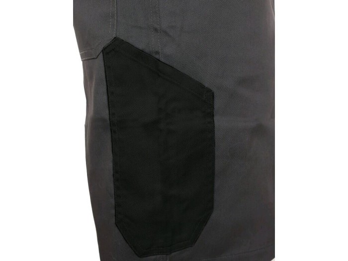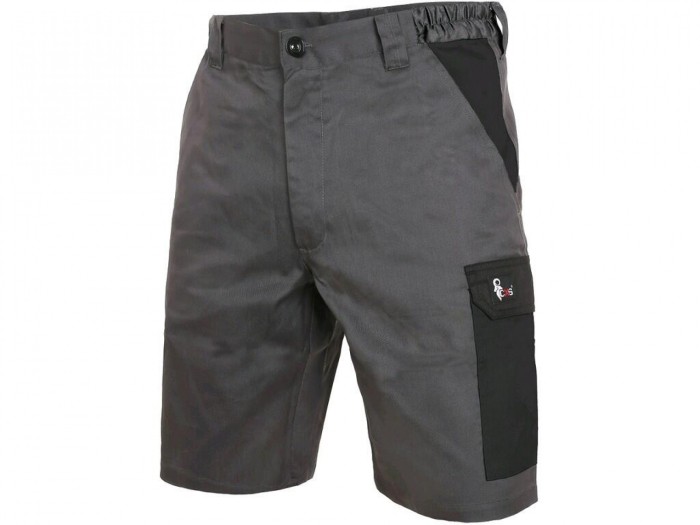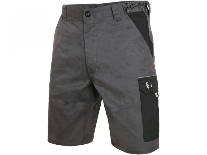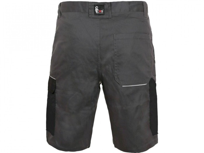 Szorty robocze męskie, pas ze szlufkami na pasek, kieszenie klinowe z przodu, kieszeń boczna z patką, kieszeń na składany/ zwijany metr, tylna zwykła kieszeń po prawej stronie.