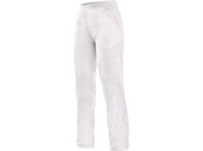 Spodnie damskie, wiązany w pasie, zapinane z boku na guziki, z tyłu wszywka z guzikami do ściągania.