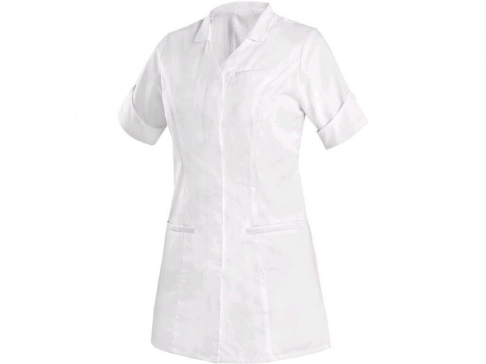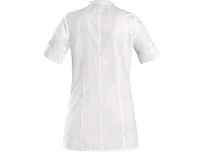 Damska bluza z krótkim rękawem, fason dopasowany do figury, ukryte zapięcie na guziki, 3 przednie kieszenie ozdobione satynowym wykończeniem.