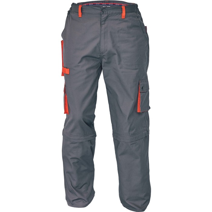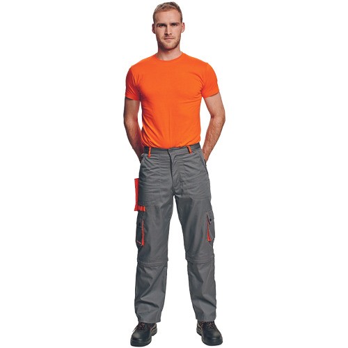 Spodnie do pasa 2w1 DESMAN/ CERVA spełniają normy . Wygodne i bardzo uniwersalne spodnie robocze z odpinanymi nogawkami. Kolor: szary z pomarańczowymi wstawkami. Rozmiar: 46-60. Fason STANDARD. Wykonane z wytrzymałego materiału: 65% poliester, 35% bawełna, 235 g/m2. Tkanina jest wytrzymała mechanicznie a jednocześnie miękka i wygodna w użyciu. Spodnie solidnie odszyte, mocne szwy, wstawki kolorystyczne, wygodny fason, praktyczne kieszenie, guma ściągająca w pasie, szlufki na pasek, odpinane nogawki, regulacja nogawek na rzepy VELCRO. Bardzo wygodne i jednocześnie wytrzymałe spodnie robocze sprawdzą się przy każdej pracy. Dedykowane dla budowlańców, branży montażowo-instalacyjnej, do prac magazynowych, porządkowych, warsztatowych.