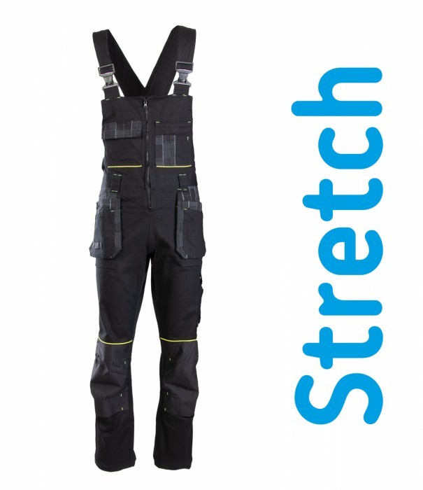 Szelki: długie, szerokie, regulowane szelki. Materiał: wykonana z wysokiej jakości materiału, który nawet po wielokrotnym praniu zapewnia stabilność rozmiarów. Budowa/szycie: podwójne szwy, szyte mocną nicią, duża ilość ryglówek w miejscach szczególnie narażonych na rozprucie, spodnie posiadają szlufki na pasek, długi dwustronny zamek ułatwiający zdejmowanie spodni, szlufka na młotek, kontrastowa lamówka. Kieszenie: dwie kieszenie w tylnej części spodni, wzmocnione kieszenie boczne, wzmocnione kieszenie zapinane na rzepy, dwie kieszonki na długopisy, kieszeń na dokumenty, kieszeń na miarkę „metrówkę”, dwie chowane kieszenie monterskie, ergonomiczna kieszeń na nakolanniki wykonana z CORDURY, Gramatura: 300g/m2; Materiał: Bawełna/Spandex (97%/3%);