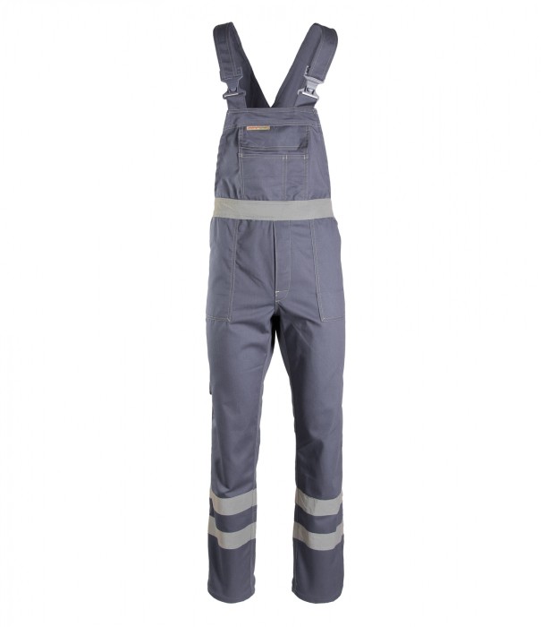 Szelki: długie, szerokie, regulowane szelki. Materiał: wykonany z wysokiej jakości materiału, który nawet po wielokrotnym praniu zapewnia stabilność rozmiarów i kolorów. Budowa/szycie: podwójne szwy, szyte widoczną, mocną nicią, duża ilość ryglówek w miejscach szczególnie narażonych na rozprucie, szlufka na młotek. Kieszenie: wewnętrzna kieszeń na dokumenty zapinana na zamek, wzmocniona kieszeń zapinana na rzepy, kieszeń na komórkę, kieszeń na długopisy, kieszeń na miarkę „metrówkę”, dwie wzmocnione kieszenie boczne. Regulacja obwodu: możliwość regulacji w pasie za pomocą guzików oraz gumki wszytej w tylnej części spodni. Elementy odblaskowe: podwójne taśmy odblaskowe o właściwościach fluorescencyjnych, Gramatura: 290g/m2; Materiał: Poliester/Bawełna (65% /35%); Cechy: posiadają pasy odblaskowe;