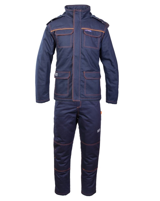 Kurtka: ocieplina 100% poliester, 200g/m2 +/-3%, kaptur odpinany, ocieplany, regulowany, zapinana na zamek kryty listwą, dwie kieszenie boczne, wykonana z wysokiej jakości materiału, który zapewnia po wielokrotnym praniu stabilność kolorów i rozmiarów, podwójne szwy, szyte widoczną, mocną nicią, gumka i sznurek ściągający pas; ściągacze w rękawach; dwie górne kieszenie kryte listwą zapinaną na napy; wstawki kolorystyczne, lamówki kolorystyczne; podszewka 100 % bawełna. Spodnie ogrodniczki: duża ilość ryglówek w miejscach szczególnie narażonych na rozprucie, możliwość regulacji w pasie za pomocą guzików oraz gumki wszytej w tylnej części spodni, długie, szerokie, regulowane szelki, dwie kieszenie boczne, kieszeń na miarkę „metrówkę”, szlufka na młotek, podwójne szwy, szyte widoczną, mocną nicią, wykonane z wysokiej jakości materiału, który zapewnia po wielokrotnym praniu stabilność kolorów i rozmiarów, ocieplina 100% poliester, 120g/m2 +/-3%, dodatkowa kieszeń z boku spodni, podszewka 100 % bawełna; Gramatura: 320g/m2; Materiał: Bawełna (100%);