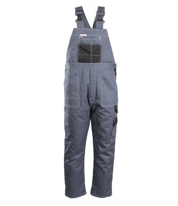Materiał: Materiał: 65% poliester/ 35% bawełna, gramatura 290 g/m2. Ocieplina: ocieplina 100% poliester, 200g/m2 +/-3%. Podszewka: podszewka 100% nylon. Budowa/szycie: podwójne szwy, szyte widoczną, mocną nicią, wykonane z wysokiej jakości materiału, który zapewnia po wielokrotnym praniu stabilność kolorów i rozmiarów, duża ilość ryglówek w miejscach szczególnie narażonych na rozprucie, długie, szerokie, regulowane szelki, wzmocnienie materiału po wewnętrznej stronie nogawki, u dołu. Kieszenie: kieszeń na dokumenty zapinana na zamek, kieszeń na miarkę „metrówkę”, wzmocnione kieszenie boczne, dwie kieszenie boczne, kieszeń na długopisy. Regulacja obwodu: możliwość regulacji w pasie za pomocą guzików oraz gumki wszytej w tylnej części spodni, regulowana szerokość nogawki,