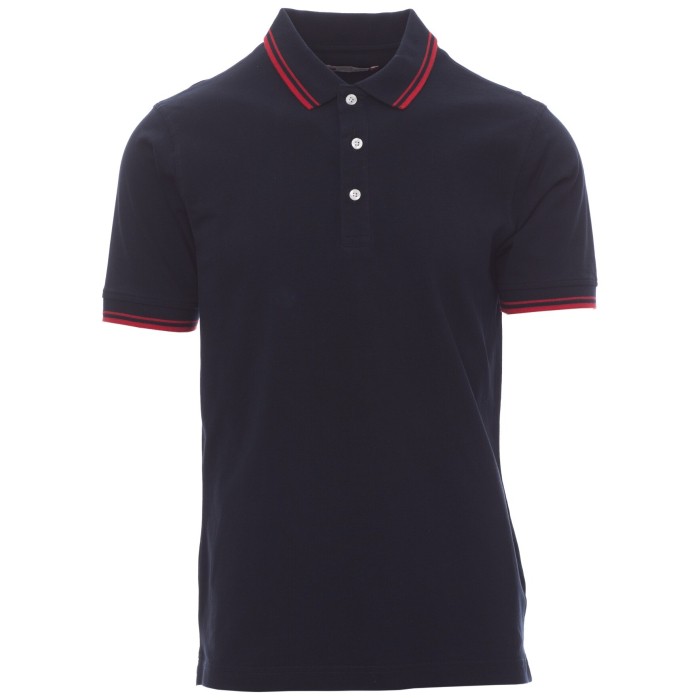 Koszulka polo męska z krótkim rękawem, 3 białe guziki, eleganckie kontrastowe wykończenie kołnierzyka i rękawów, kołnierzyk i krawędź rękawa ze ściągaczem, rozcięcia boczne ze wzmocnionymi szwami, zasłonięte szwy na kołnierzyku, boczna taśma wzmacniająca, szwy elastyczne, taśma w obszyciu wewnętrznym kołnierzyka.