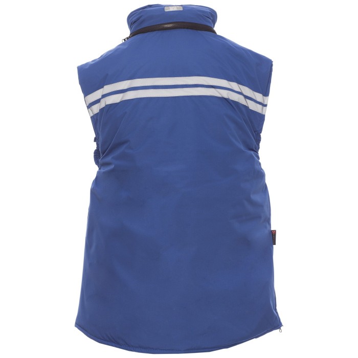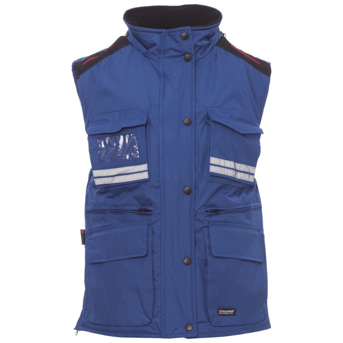 Ergonomiczna kamizelka damska, 8 mm plastikowy zamek błyskawiczny z metalowym suwakiem, z klapką i guzikami z tworzywa sztucznego, odpinany i-lub składany kaptur, szare paski odblaskowe z przodu i z tyłu, rozcięcie boczne z klinem i zamkiem błyskawicznym, dziewięć kieszeni zewnętrznych, z czego dwie z zapięciem LOCK SYSTEM i dwie z zamkiem błyskawicznym i wzmocnieniem wewnętrznym, jedna z dwustronnym uchwytem na identyfikator