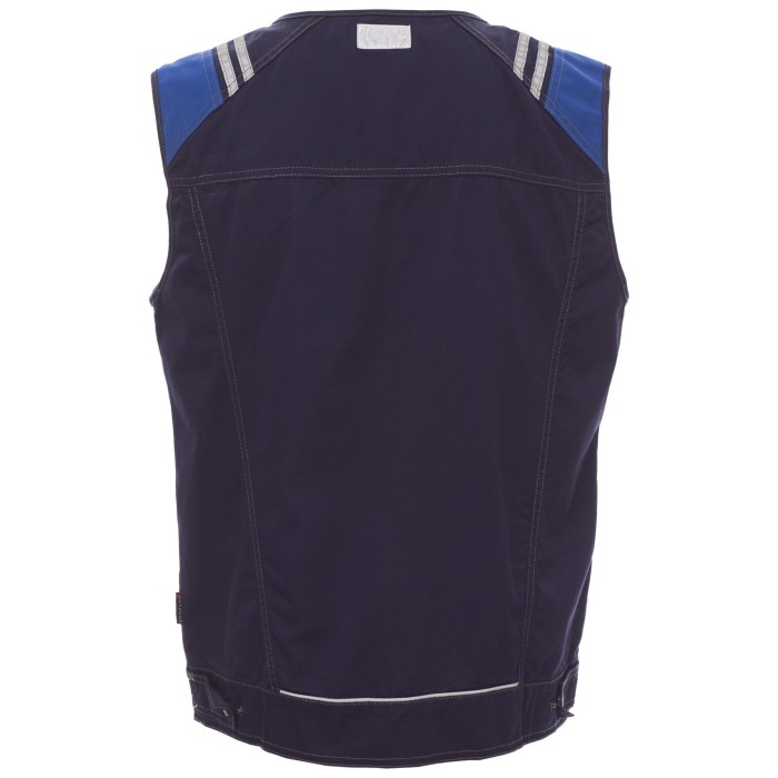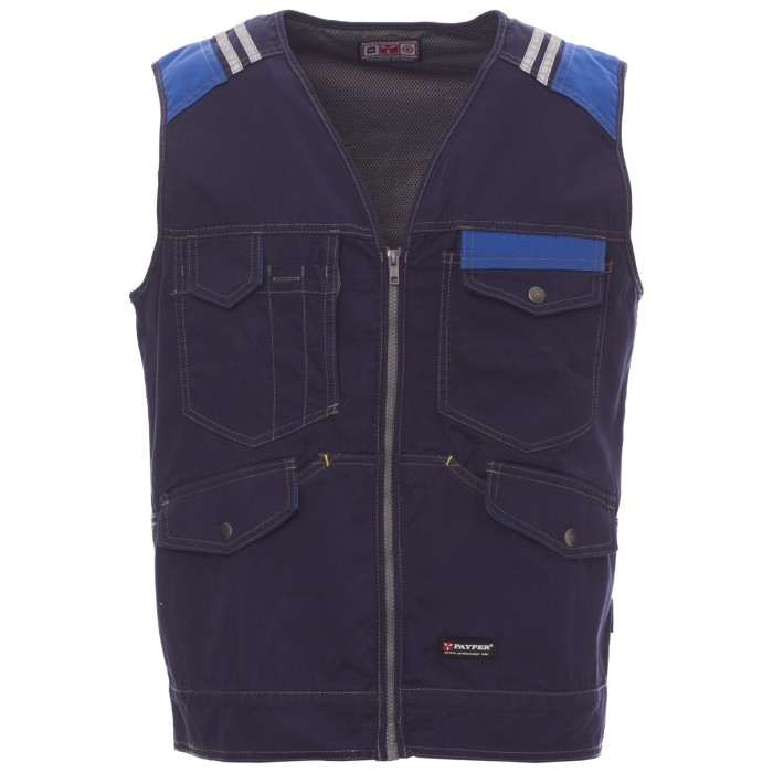 Kamizelka męska w dwóch odcieniach, zapinana z przodu na plastikowy zamek błyskawiczny, w pasie zapinana na guzik, trzy kieszenie z przodu z zapięciem LOCK SYSTEM, dwie wykonane jako kieszenie-kangurki z klapką i guzikiem metalowym, odpinany rozkładany uchwyt na identyfikator, wielofunkcyjna kieszonka na klatce piersiowej.
