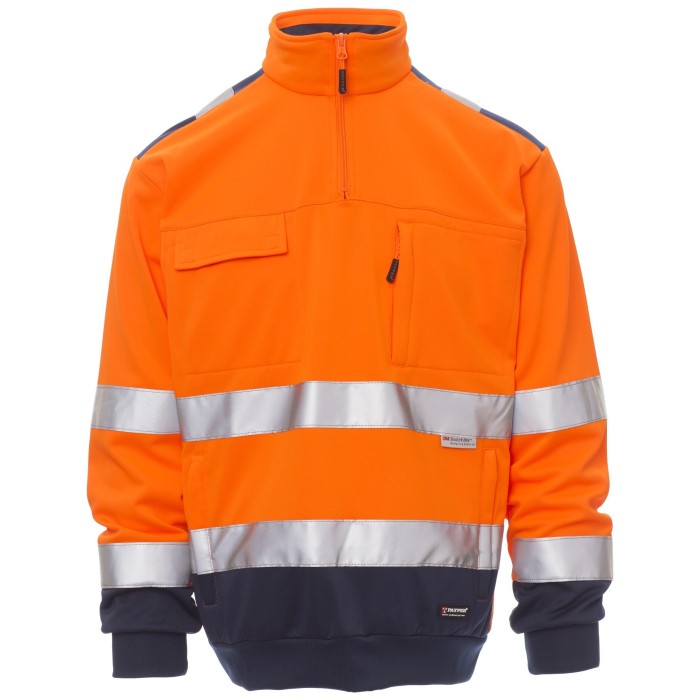 Bluza męska o dużej widoczności z paskami 3M, z nylonowym zamkiem błyskawicznym krótkim z suwakiem metalowym, mankiety i dół ze ściągaczem, dwie kieszenie przednie z zamkiem błyskawicznym zasłoniętym, jedna kieszeń na klatce piersiowej z zapięciem LOCK SYSTEM i odpinanym, rozkładanym uchwytem na identyfikator, jedna kieszeń na zamek błyskawiczny ze wzmocnionymi szwami
