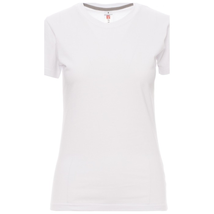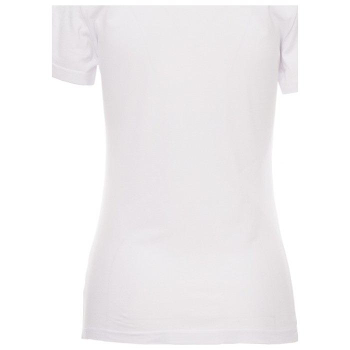 T-shirt z krótkim rękawem damski, dopasowany, dekolt okrągły, z wykończeniem dekoltu w postaci taśmy 1,5 cm ściągacza z dodatkiem spandeksu, obszycie wierzchnie z przodu, kontrastująca taśma wzmacniająca na całej szerokości barków, widoczna na spodniej części kołnierzyka, szwy elastyczne, szwy na bokach