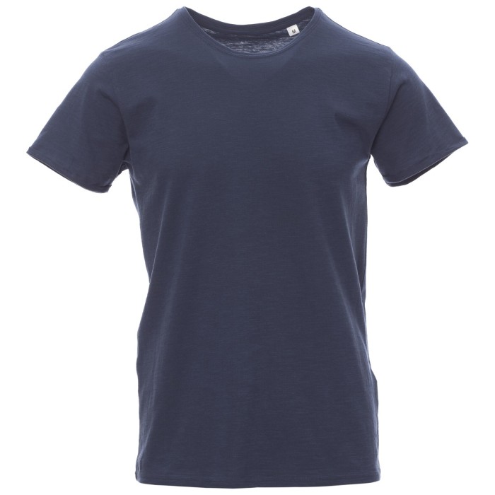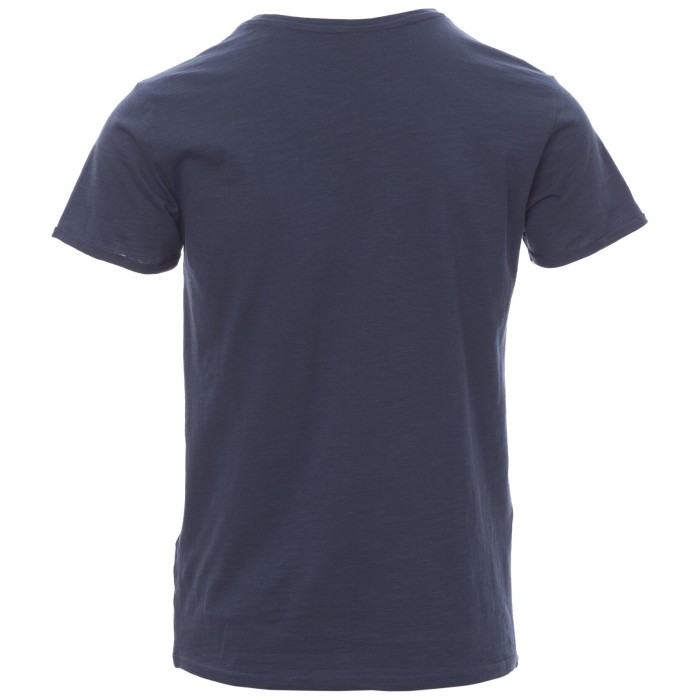 T-shirt męski z krótkim rękawem, dekolt lekko pogłębiony, wykończenie dekoltu taśmą 1 cm z dodatkiem spandeksu, dopasowane rękawy z podwójnymi przeszyciami wewnętrznymi, rękawy z wąskim wywinięciem bez obrębienia, szwy boczne, bez etykiety