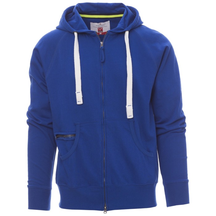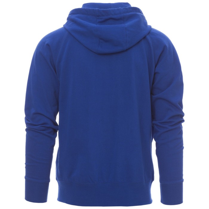 Bluza męska z kapturem, rozpinana, zamek błyskawiczny SBS zasłonięty z podwójnym suwakiem metalowym, kaptur z podwójnymi szwami i białym sznurkiem, z kontrastowymi przeszyciami i kółkami metalowymi, rękawy raglanowe, kieszenie-kangurki, kieszonka na zamek błyskawiczny, mankiety i dół ze ściągaczem, wzmocnione szwy.