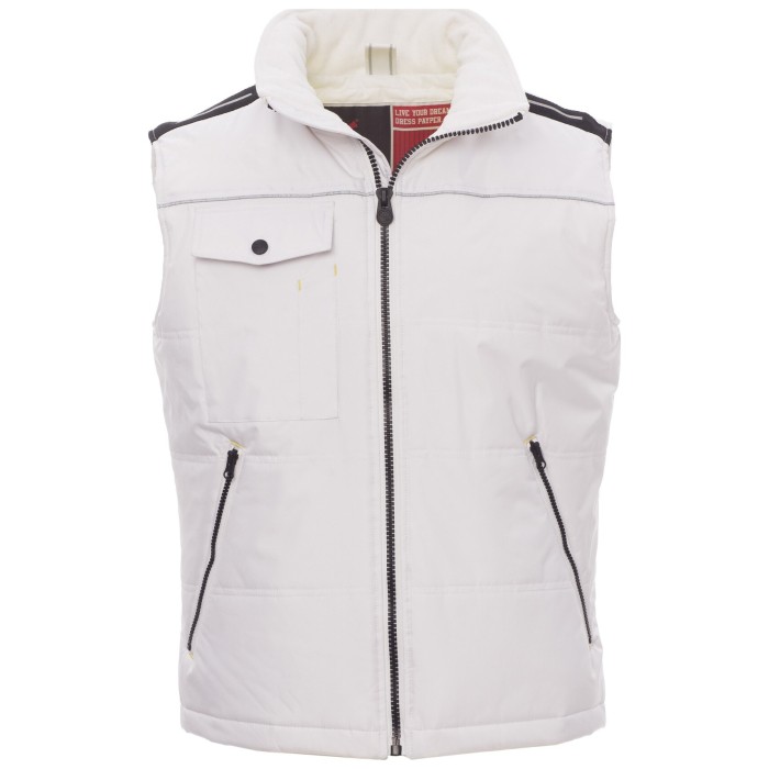 Kamizelka unisex z 8 mm plastikowym zamkiem błyskawicznym z metalowym suwakiem, wyprofilowane plecy, dwie przestronne kieszenie zewnętrzne z zamkiem błyskawicznym, przestronna kieszeń na klatce piersiowej na smartfon, pierścień na identyfikator, paski odblaskowe na klatce piersiowej i plecach
