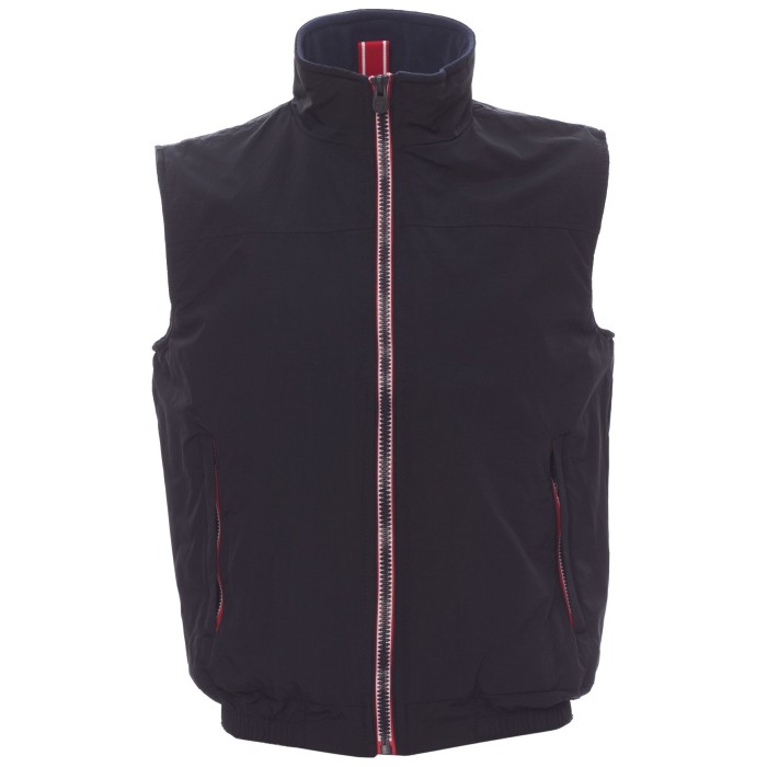 Kamizelka unisex, 8 mm zamek błyskawiczny w kontrastującym kolorze, z gumką w talii, dwie kieszenie zewnętrzne z zasłoniętym zamkiem błyskawicznym.