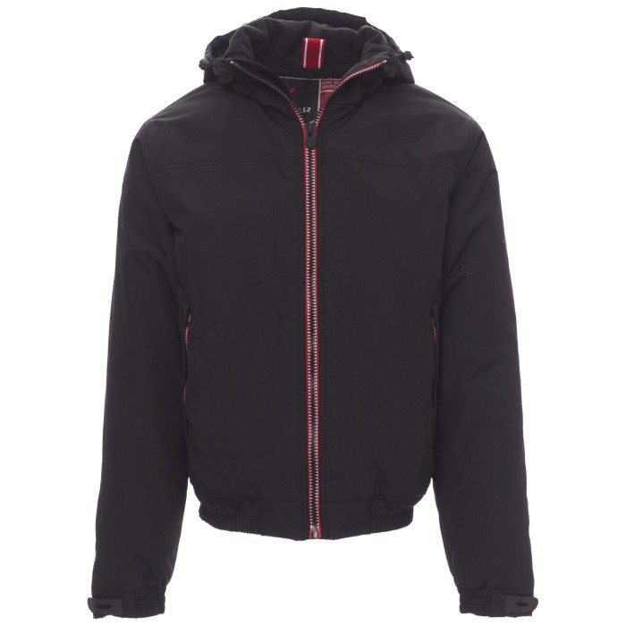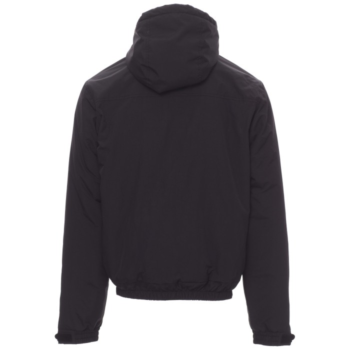 Kurtka męska ocieplana, kontrastowy zamek błyskawiczny 8 mm, profilowany kaptur z dwoma szwami i sznurkiem ściągającym, elastyczna talia, elastyczne mankiety i regulowany gumowy ściągacz na nadgarstek, dwie kieszenie zewnętrzne z chowanym zamkiem błyskawicznym.