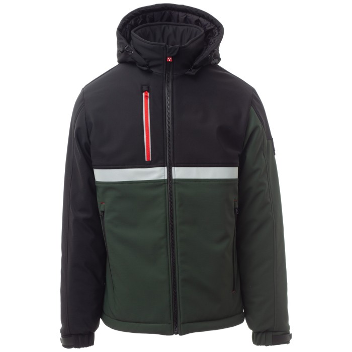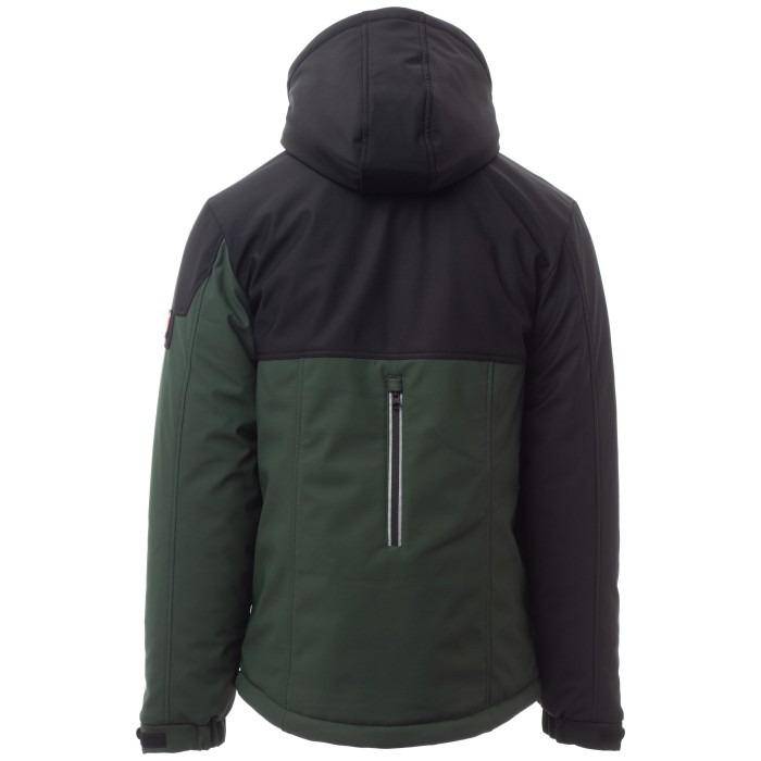 Męski 3-warstwowy soft-shell z grubym ociepleniem (160g-m2) i kołnierzem z polarowymi wstawkami, zapinany na zamek błyskawiczny SBS z metalowym suwakiem „semi-autolock” i spersonalizowanym ściągaczem.