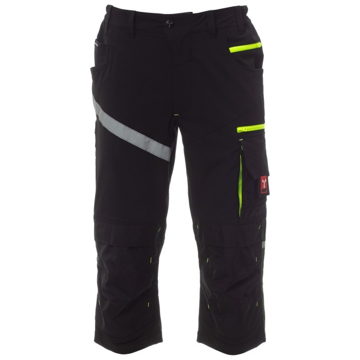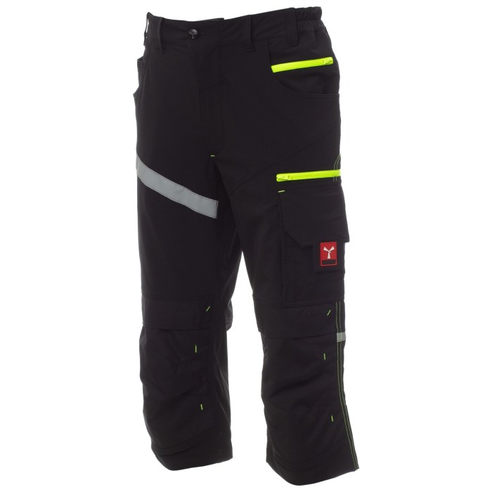 Z tyłu znajdują się: kieszeń z klapką zapinana na rzep, pętla na młotek, otwarta kieszeń na taśmę mierniczą oraz kieszeń na telefon z klapką i rzepem (prawa nogawka); otwarta kieszeń z dwoma paskami odblaskowymi (lewa nogawka); odblaskowe wstawki na wysokości kolan na obu nogawkach.