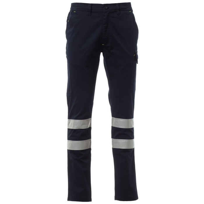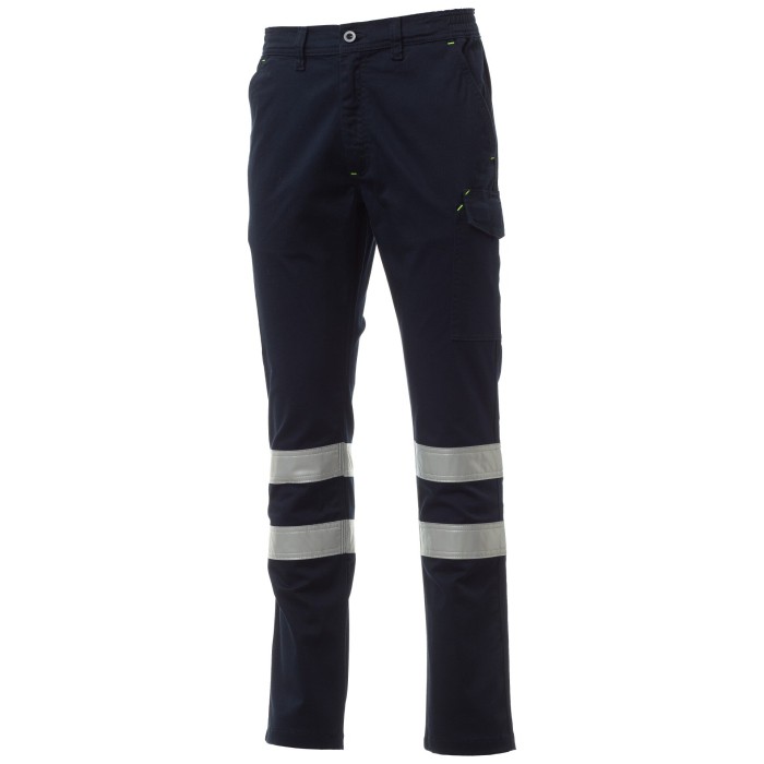 Letnie spodnie wykonane z bawełny twill stretch, z paskami odblaskowymi kategorii 1, z szlufkami i gumką w pasie.