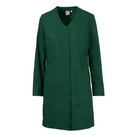Długi damski fartuch z dekoltem w szpic, wykonany z bawełnianej popeliny, poliestru i Lycry® T400®, o doskonałych właściwościach elastycznych i oddychających.