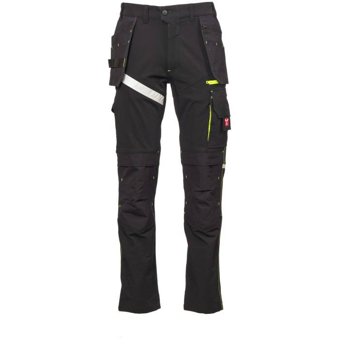 Z tyłu znajdują się: kieszeń z klapką zapinana na rzep, pętla na młotek, otwarta kieszeń na taśmę mierniczą oraz kieszeń na telefon z klapką i rzepem (prawa nogawka); otwarta kieszeń z dwoma paskami odblaskowymi (lewa nogawka); odblaskowe wstawki na wysokości kolan i dół wykończony taśmą wzmacniającą z kontrastowego materiału na obu nogawkach.