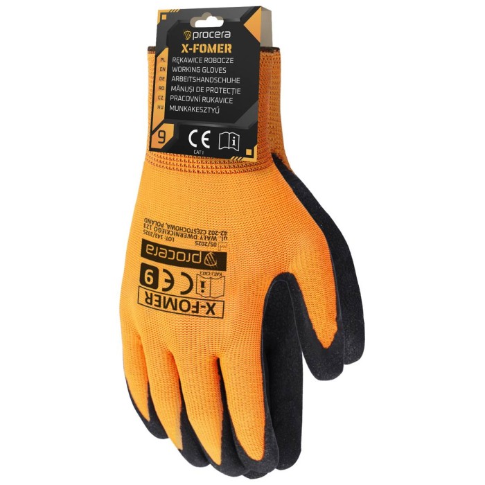 Rękawice X-FOMER wykonane z dzianiny poliestrowej w kolorze pomarańczowym, powlekane w części chwytnej pianką lateksową o szorstkowanej strukturze. Idealne do prac manualnych. Bardzo dobre czucie trzymanego przedmiotu. Bardzo dobra manualność i przyczepno...