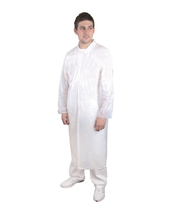 Płaszcz ochronny PE STEVE/ ARDON spełnia normy EN 343/ CAT. I. Odzież przeciwdeszczowa, uniwersalna, zarówno dla kobiet jak i dla mężczyzn. Wykonany z białego 100% polietylenu, 30 mikronów grubości. Zapinany na zatrzaski, bez kaptura, długość MIDI, długi rękaw. Skutecznie chroni przed wilgocią. Wygodny, nie ogranicza ruchów. Dedykowany pracy, gdzie wymagane są wysokie standardy higieniczne. Sprawdza się w gastronomii, cateringu, przemyśle spożywczym, często jako odzież dla odwiedzających.