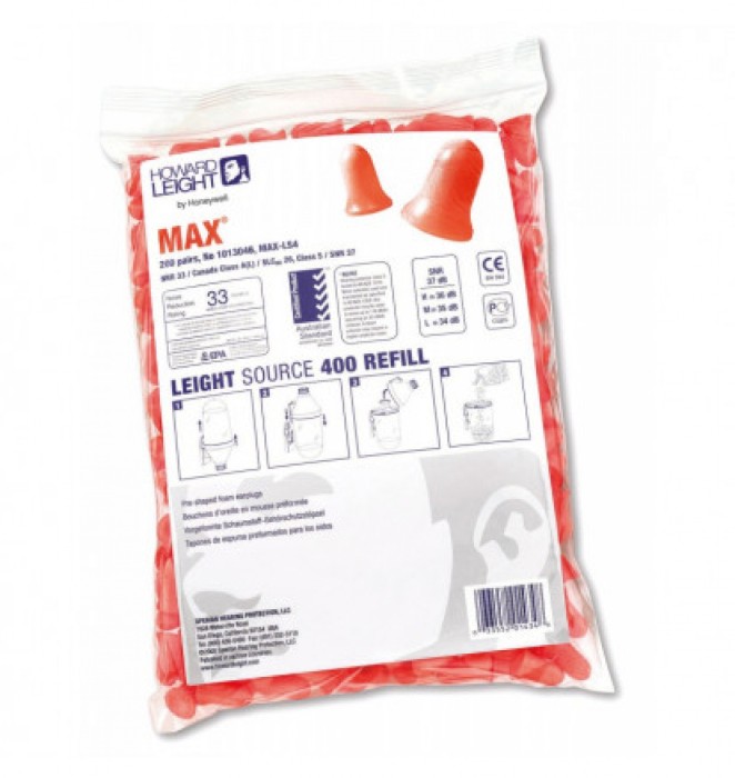 Zatyczki MAX REFILL LS400 (200 par)/ HONEYWELL spełnia normy EN 352-2 (Ochronniki słuchu-Wymagania ogólne- Część 2: Wkładki przeciwhałasowe). Ubytek słuchu spowodowany hałasem postępuje stopniowo dlatego ważne jest zapewnienie sobie i pracownikom odpowiedniej ochrony w trakcie narażenia na hałas. Wykonane z miękkiej pianki poliuretanowej w kształcie dzwonu zapewnia łatwość wkładania i wyciągania. Prawidłowe włożenie zatyczek polega na sięgnięciu nad głową wolną ręką, podciągnięciu ucha do góry i włożeniu zatyczki głęboko do kanału słuchowego. Przytrzymaniu jej przez 30 – 40 sekund, aż zatyczka całkowicie rozpręży się w kanaliku ucha. Po prawidłowym założeniu końce zatyczek nie powinny być widoczne dla osoby patrzącej od przodu na użytkownika zatyczek. Zatyczki MAX REFILL są odporne na wypadanie z kanału słuchowego, mniejsze ciśnienie rozprężania zapewnia komfort długotrwałego noszenia. Gładka oporna na zabrudzenia powłoka zapobiega osadzaniu brudu na wkładce. Każda osoba ma inny kanał słuchowy dlatego bardzo ważne jest odpowiednie dopasowanie rozmiaru zatyczki, źle dobrany rozmiar spowoduje dyskomfort podczas noszenia i nie pełnowartościową ochronę słuchu. Jednorazowe wkładki przeciwhałasowe zapewniają bardzo wysoką wartość ochrony przed hałasem.